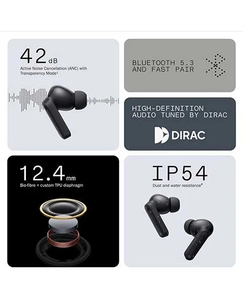 - Orientation Type: In EarConnectivity: Bluetooth Version 5.3Battery Life: 35.5 HoursFast Charging: YesNoise Cancellation: Active Noise CancellationUSP: IP54 Dust and Water Resistant, Low Lag Gaming Mode
