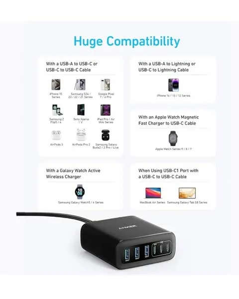 6-in-1 Charger for All: Designed for modern needs, this charger can power your entire digital lineup, from laptops to smartphones, all at the same time. Note: 30W charging is limited to the USB-C1 port for MacBook Air.