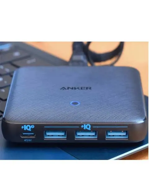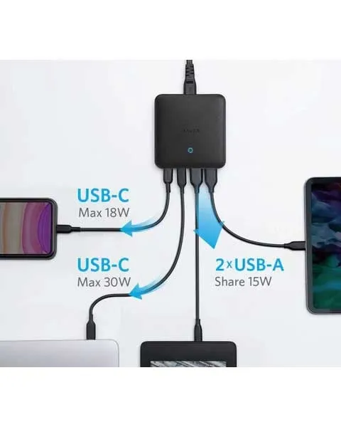 Charge 4 devices simultaneously A PowerIQ 3 0 enabled USB-C port pumps out a max 45W output to charge virtually any USB-C device at top speed while 3 USB ports share a total of 20W to provide optimized charging for mobile devices