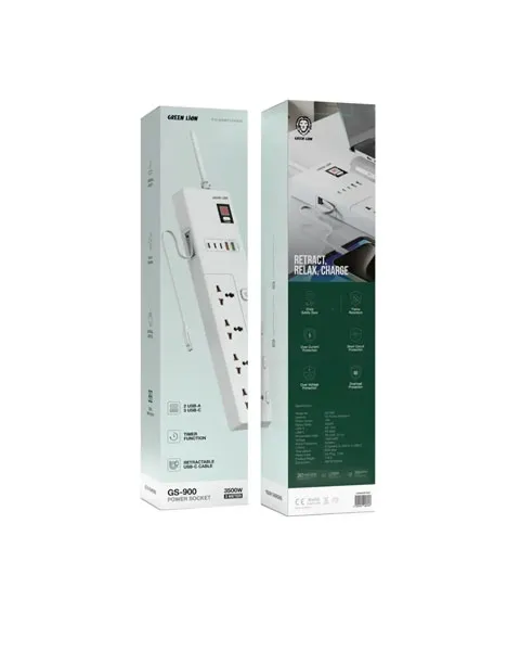 The Green Lion GS-900 Power Socket 3M 3500W is a robust, durable power solution for contemporary needs. Durability meets safety with its construction in PC flame-retardant material to back up the output of 3500W at a rated current of 13A. Equipped with four sockets, 2 USB-A QC 18W, 3 USB-C PD 35W, and a retractable USB-C cable (PD 20W) 70cm long, multiple devices can be charged fast and efficiently. This product includes a child safety door, over-current, over-voltage, short-circuit, and overload protection. It comes with a digital timer display, individual buttons, and a 3-meter UK plug power cord for convenience in functionality and peace of mind for all your power needs.