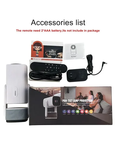 Pan Tilt Lamp Projector Proprietary products exclusive private model Cell phone controls ambient lights. 1280*720 pixels, support max 1080P, 2K, 4K decoding using HD signal. · 1280*720 pixels, support max 1080P, 2K, 4K decoding using HD signal · Wireless:2.4G & 5G WiFi · CPU: H713/Quad-core ARM Cortex-A53 · GPU: Mali-G31 supports OpenGL ES3.2,Vulkan 1.1,and OpenCL2.0 · Bluetoth-compatible: BT 4.1- Contrast ratio: 1500:1 · Support Airplay, Miracast, Mirror screen · Projection screen size: 40-130 inches · Automatic correction