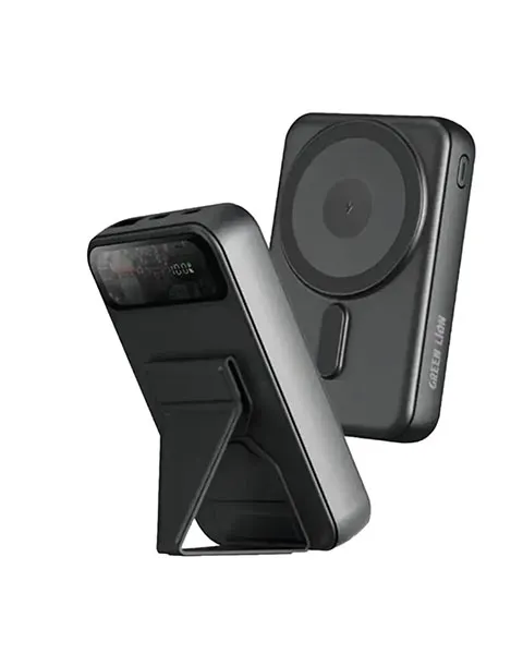 The Green Lion Prague 10000mAh MagSafe Power Bank makes it easy to carry fast, efficient, and wireless charging. MagSafe technology seamlessly and securely magnetically connects iPhones and compatible devices. A battery capacity of 10000mAh can provide multiple charges, while the PD 20W Type-C output and a 22.5W USB-A output guarantee high-speed wired charging. It also has a 15W wireless charge for a more convenient experience without the cables. The LCD power display informs you of the battery level, with an adjustable bracket for hands-free operations. It is an ideal travel companion and for everyday use.