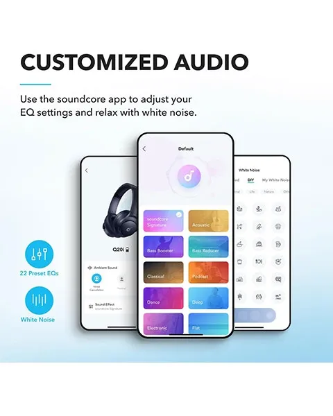 App for EQ Customization: Download the soundcore app to tailor your sound using the customizable EQ, with 22 presets, or adjust it yourself. You can also switch between 3 modes: ANC, Normal, and Transparency, and relax with white noise.
