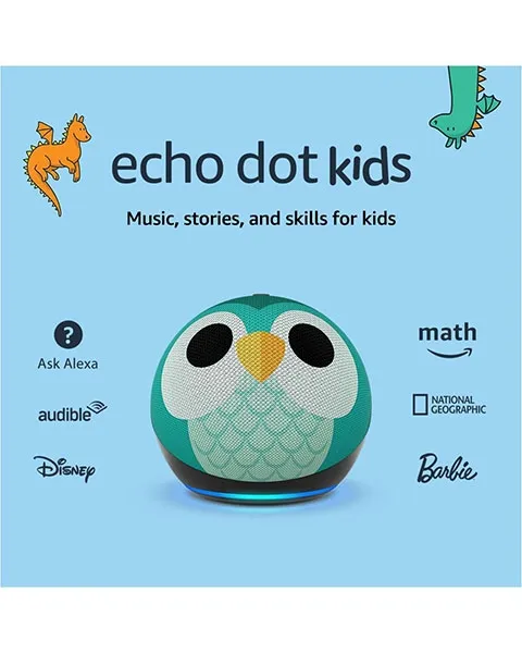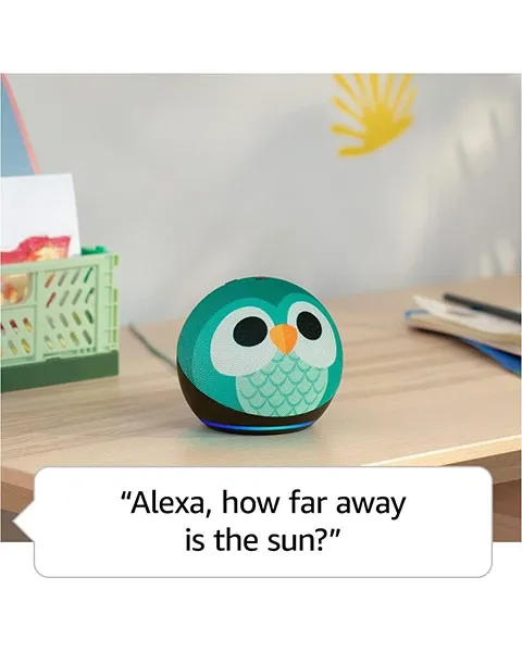 Our most popular and cutest smart speaker with Alexa is made for kids (not a toy). The improved speaker delivers clearer vocals and rich, vibrant sound. Kids can ask Alexa to play music, read a bedtime story, get help with their homework, and more. Stream songs from Amazon Music, Apple Music, Spotify, and others. Alexa will automatically give kid-friendly responses and filter explicit songs. You can also set daily time limits and review activity in the Amazon Parent Dashboard. Kids can help take charge of their routines with Alexa by setting their alarms, turning off compatible smart lights, and calling parent-approved friends and family. Kids can customize the way their Alexa sounds with a pretend owl or dragon voice, along with character-inspired songs, jokes, and greetings.