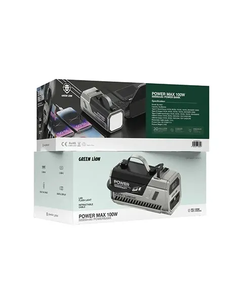 The Green Lion 50000mAh Power Bank 100W is the perfect charging buddy, ideal for having your devices charged when on the go. It has an enormous 50000mAh capacity and can charge a maximum of 5 devices simultaneously using its 2 USB-A ports, 2 USB-C ports, and 1.5m extendable cable. It supports fast charging with Type-C1 and Type-C2 interfaces delivering a total of 100W PD and USB-A1 & USB-A2 interfaces delivering a maximum of 22.5W, which means speedy charging. Its digital screen will notify you of battery charges, and the LED flashlight does not allow you to feel blindfolded. Tastefully styled, the telescoping cable and built-in carry handle make lugging a hassle-free and comfortable experience. Wherever you are on the go, at work, or simply in need of backup power the Green Lion 50000mAh Power Bank 100W offers quick, reliable, and efficient charging.
