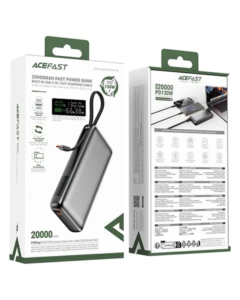 High-Capacity Power Bank. The ACEFAST M22-20000 boasts a 20000mAh (74Wh) capacity with a rated capacity of 12000mAh, providing ample power for your devices on the go. Fast Charging Capabilities. Support bi-directional fast charging through the built-in Type-C cable, this power bank ensures rapid charging for multiple devices simultaneously. Multiple Output Options. Featuring a built-in USB-C cable, USB-C port, and USB-A port, it supports various charging combinations to meet different device needs. Smart LED Display. The digital LED screen shows battery percentage, charging power, and remaining charging time, keeping you informed of your power bank’s status. Premium Build Quality. Constructed with flame-retardant PC material and high-quality lithium polymer battery cells for enhanced safety and durability. Travel-Friendly. Compliant with UN38.3 international air transport standards, this power bank is approved for carry-on luggage, making it perfect for travelers. Low Current Mode. Supports a special low current output mode for Bluetooth earphones, ensuring safe charging for smaller device