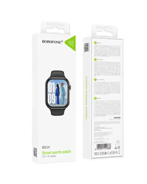 Borofone Smartwatch BD14 – black is an advanced watch featuring a large color display and IP65 waterproof rating, combining elegant design with versatile health-tracking and notification functions. The zinc-alloy case ensures durability, while its lightweight build offers all-day comfort.