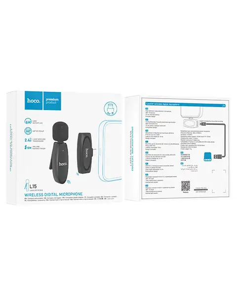 HOCO L15 Wireless Lavalier Microphone For iPhone 2.4GHZ Portable Mini Audio Video Recording MIC Live Broadcast Microphone L15 For iPhone Lavalier Wireless Microphone Feature? 1. Omnidirectional electret 2. Receiver audio plug: For iPhone plug 3. Mobile phones and tablets compatible For IOS interface support system upgrade 4. Battery capacity: 70mAh (button battery) 5. Service time: 6 hours 6. Weight: 12g
