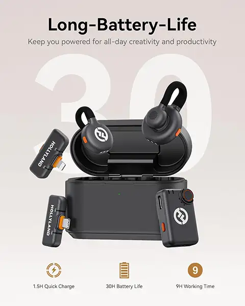 30H Long Battery Power: Enjoy 9 hours of working time per transmitter/receiver (noise cancellation off) with a quick 1.5-hour recharge. The charging case adds 2.5 full charges, delivering up to 30 hours of total battery life (Lark M2 Mobile Version 27H) to keep you powered for all-day creativity and productivity.