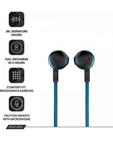 JBL TUNE 205BT wireless earbud headphones with JBL Pure Bass Sound. Thanks to the 6-hour battery life they can wirelessly stream JBL Pure Bass sound and provide hands-free call management. Inside the premium housing is a pair of 12.5 mm drivers which will punch out some serious bass, while the soft, ergonomically shaped earbuds ensure the listening experience remains comfortable for long-listening hours. In addition, a single-button remote lets you control music playback, as well as answer calls on the fly with the built-in microphone, making the JBL TUNE 100BT your everyday companion for work, at home and on the go.
