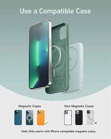 For best results, use a power adapter with at least 12W output (not included). | Not compatible with non-magnetic phone cases, such as Otterbox defender cases. | Magnetic and metal attachments such as cards, keys, and pop grips will interfere with charging. | The magnetic charge provides up to 7.5W maximum power. | When the portable charger is charging or discharging, some heat may be generated due to energy loss during transmission. This is a normal occurrence. | Does not support charging two devices at once. The device that is connected to a cable will be given priority over the device that's being charged wirelessly. | Due to the incompatible size of the portable charger, it is not recommended to use with iPhone 13/12 mini.
