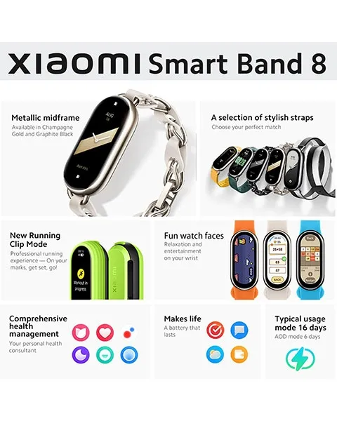 The Xiaomi Mi Smart Band 8 in Black is a cutting-edge fitness tracker that combines style and functionality. This sleek wearable boasts a vibrant AMOLED display, offering crisp visuals for tracking your health and fitness data. With advanced features such as heart rate monitoring, sleep tracking, and activity recognition, it provides comprehensive insights into your daily well-being. The band is water-resistant, making it suitable for various activities, including swimming. It also offers smartphone notifications, allowing you to stay connected on the go. With impressive battery life, the Mi Smart Band 8 is a reliable companion for your fitness journey, blending seamlessly with your lifestyle.