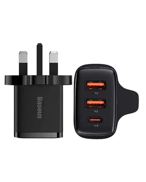 The charger from Baseus will allow you to give up carrying two chargers with you. All thanks to a special project. In the upper part of the plug there are three USB inputs, the first of them is type C, while the second and third are type A. Thanks to this solution, you can resign from two separate chargers and replace it with one, which is much more practical and takes up less space in your purse or bag. backpack. An additional advantage of this solution is the ability to charge two devices at the same time, occupying only one socket.