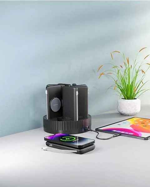 ?Powerology's *8 10000mAh Power Bank Terminal lets you reach the highest level of charging. It offers unmatched power lifetime because of its remarkable eight 10000mAh units. With its adaptable built-in Type-C and Lightning connectors, it can connect to a wide range of devices, and its rapid charging station, supported by a strong 120W charging base input, makes sure you're always fully charged. The 18W USB-C input, 20W USB-C output, and USB-A's QC 3.0 capabilities allow you to discover the efficient charging regions. For those who want to be cord-free, the addition of a 15W wireless output adds a modern feel. In addition to its great abilities, precise built-in safety measures ensure that your gadgets are shielded from possible dangers. Powerful, adaptable, and secure, this terminal represents the charging of the future.