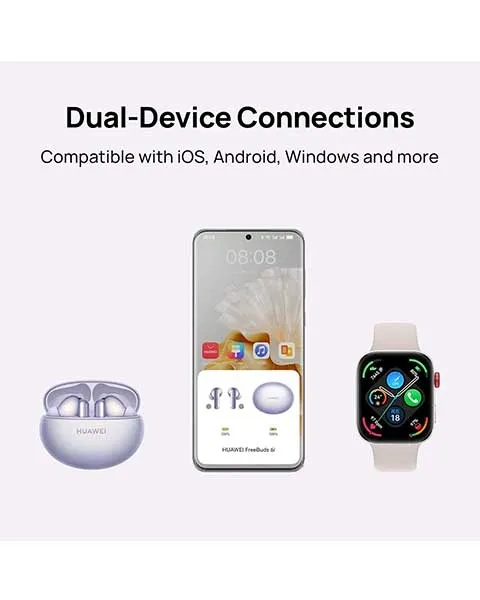 Huawei FreeBuds 6i has Bluetooth version 5.3, which connects a 10-meter range with auto pairing. Additionally, it has a 510?mAh (Case) and 55?mAh per earbud battery capacity, and you can use it for 35?hours with the Case (ANC Off), 20?hours (Earbuds with ANC Off), 8?hours with the Case (ANC On), 5?hours (Earbuds with ANC On). It will take one?hour (Case), and 40?min (Earbuds) to charge fully with Type-C cable.